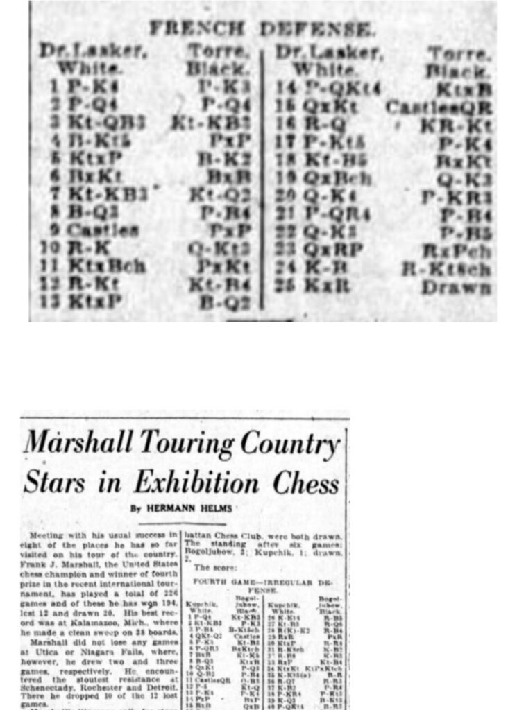 Tengo el libro de su autoría dedicado de su puño y letra al Dr. Siegbert Tarrasch. Tengo un reloj San Sebastián idéntico al que usaron Torre y Lasker en el encuentro donde se jugó el famoso «remolino». Además tengo casi todos los libros que se han editado sobre Torre.