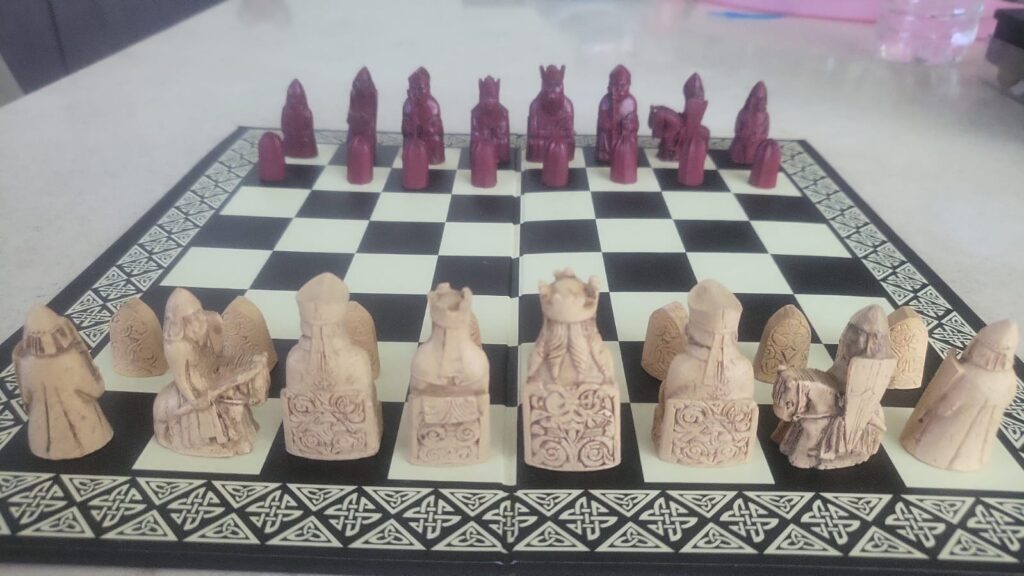 El ajedrez de mi abuelo y un calendario que hice con motivos ajedrecísticos para la confirmación de mi hijo.